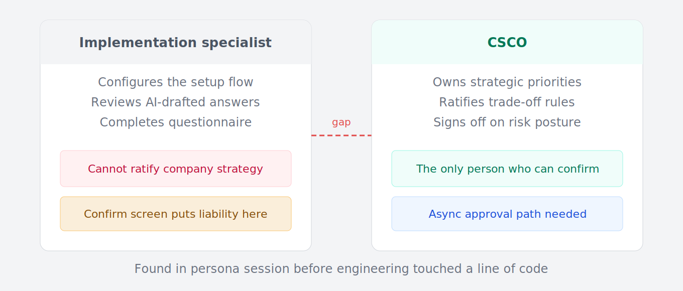 Ran a CSCO persona session against the wireframe. Key finding: the confirm screen put a strategic liability statement on the wrong person. The Implementation Specialist can't ratify company strategy, only the CSCO can. Surfaced the async approval gap before engineering touched a line of code.