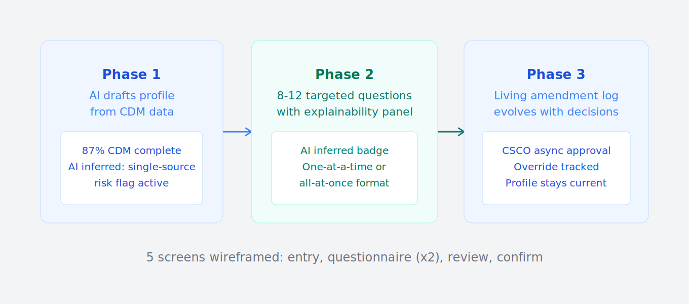 Replaced the blank form with a three-phase AI-drafted profile flow. The AI generates a draft from existing supply chain data, walks users through 8 to 12 targeted questions, and maintains a living amendment log. Wireframed five screens across two questionnaire formats with explainability panels and AI-inferred answer badges.