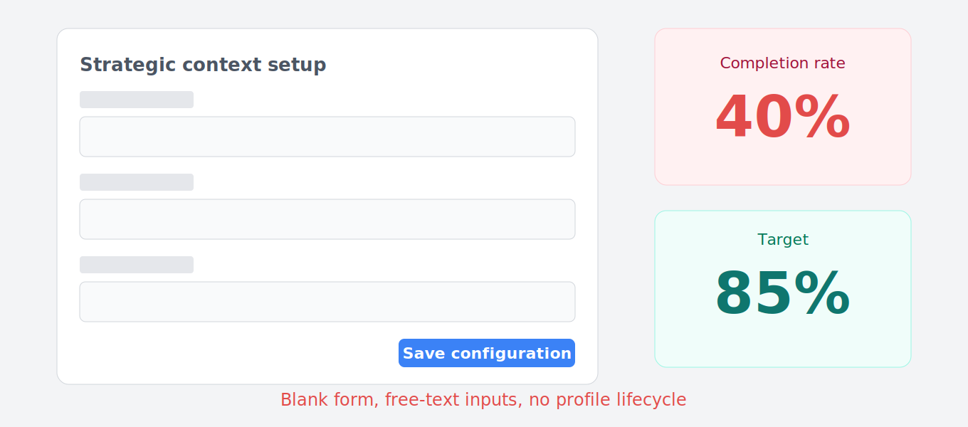 The old setup had a 40% completion rate. Users hit a blank configuration form asking for strategic context most companies had never documented. Free-text inputs degraded AI recommendation quality, and completed profiles went stale with no way to keep them current.