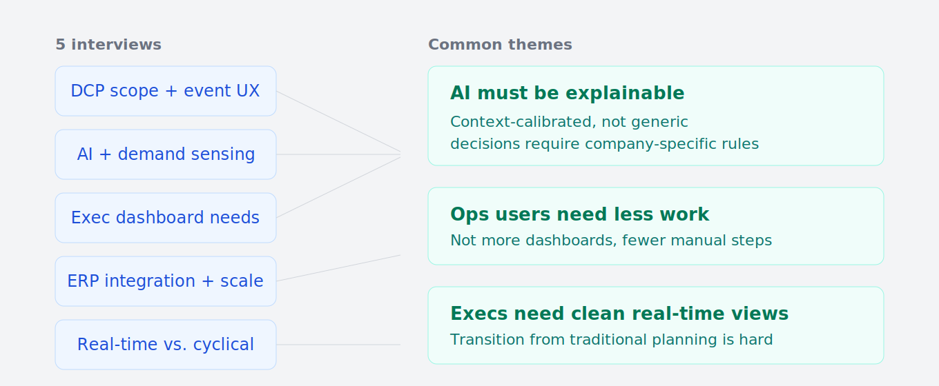 Five stakeholder interviews across executive, operational, and technical roles. Common thread: the AI needed to be explainable and contextually calibrated, and operational users needed less manual work, not more. That shaped everything downstream.
