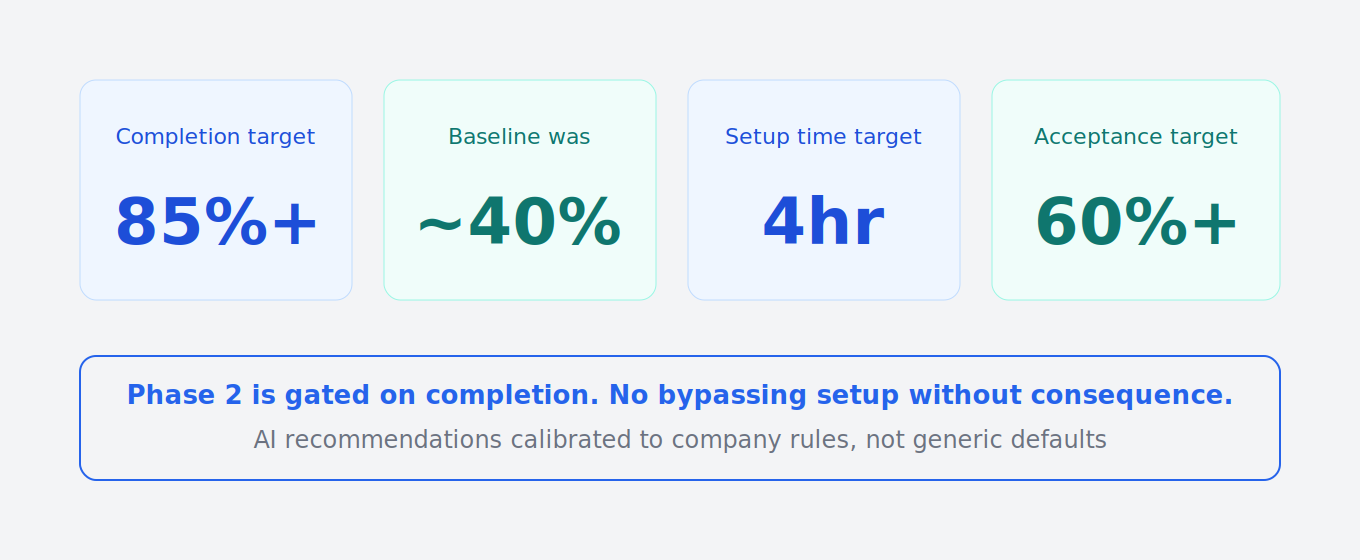 Target completion rate 85%+ versus a 40% baseline. Full setup completable in under 4 hours. Phase 2 is gated on completion so there's no bypassing setup without consequence. AI recommendations are now calibrated to company-specific rules instead of generic defaults.